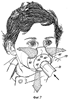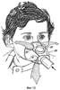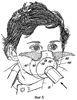 На фиг.7 дан вид спереди лицевой маски, соответствующей пятому примеру реализации и используемой в системе подачи лекарственных средств при помощи распылителя, при этом маска показана в обычном положении на пациенте, то есть маска покрывает нос и рот пациента, причем лицевая маска имеет два прохода, выполненных в ней в области глаз, а часть маски вырезана, с целью иллюстрации другого прохода, выполненного в ней.