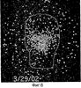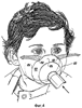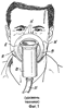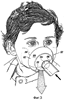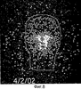 Используя распыленный солевой раствор с радиоактивными метками, выступающий как заменитель лекарства в распылителе 20, легко определяли схему осаждения частиц. Фиг.2 дает представление о характере осаждения, имеющем место в случаях, когда количество воздуха, обмениваемое за одно дыхание (или объем дыхания) составляет 50 мл при частоте дыхания 1,25 л в минуту, что типично для младенцев. Воздушный поток от распылителя 20 составляет 4,7 л в минуту, и, следовательно, в лицевой маске 10 создается повышенное давление. При этих условиях аэрозольный лекарственный препарат просачивается из-под маски в разных точках лица, что подтверждается областями повышенной концентрации, видимыми на изображении. Как следует из фиг.2, повышенное осаждение происходит в области глаз, а также на подбородке и челюсти пациента. Нужно заметить, что при использовании других систем подачи аэрозольного лекарственного препарата, также связанных с созданием повышенного давления в лицевой маске, будут получены, вероятно, схожие показатели осаждения аэрозольного лекарственного препарата в области глаз.