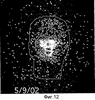 На фиг.2 представлено изображение, полученное при помощи гамма-камеры, которую использовали для сканирования макета лица при исследовании осаждения на лице радиоактивных меток. Исследование проводили с использованием обычной лицевой маски, показанной на фиг.1. Изображение на фиг.2 отражает осаждение частиц (аэрозольного лекарственного препарата), происходящее при детском типе дыхания (объем вдоха-выдоха составляет 50 мл, частота дыхания составляет 25 вдохов в минуту, коэффициент наполнения равен 0,4).
