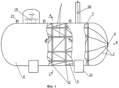 Соседние элементы устанавливаются с нахлестом. Для устранения щелей в местах нахлестов применяется герметик 15. Форма элементов атмосферостойкого слоя днищ может быть как плоской, так и соответствовать форме защищаемой поверхности. В том случае, когда защитно-декоративная облицовка днищ имеет плоскую форму, образовавшаяся полость между ней и поверхностью термостойкого теплоизолирующего слоя заполняется супертонким базальтовым волокном.
