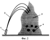 Капсулы с водой предлагается доставлять в зону пожара каким-либо внешним источником. Одним из вариантов может быть доставка капсул в спутном потоке обычной водяной струи по навесной траектории, см. фиг.2. Вылетая из источника струи 1 и двигаясь по траекториям 2, капсулы попадают в зону пожара 3. В нижней части пожара будут возникать множественные паровые взрывы капсул 4 с образованием ДВ. Кроме того, эти взрывы могут привести к дроблению крупных капель воды из спутного потока струи, проникших в пожар, и, следовательно, к дополнительному увеличению удельной поверхности воды.