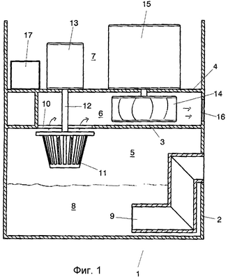 В позиции 1 на фиг.1 обозначено устройство, имеющее корпус 2. В данном корпусе 2 предусмотрены две проходящие горизонтально перегородки 3 и 4, разделяющие корпус на три части 5, 6 и 7. В самой нижней части 5 предусмотрен водяной затвор 8, в который входит воздухозаборный патрубок 9. Этот воздухозаборный патрубок вставлен над водяным затвором 8 в наружную стенку корпуса 2 так, что предотвращается выход воды через данный патрубок. В перегородке 3 предусмотрено проходное отверстие для воздуха 10, перед которым установлен сепаратор 11, соединенный приводные валом 12 с двигателем 13. Проходное отверстие для воздуха 10 входит во вторую часть 6 корпуса 2, которая ограничена перегородками 3 и 4. В данной части 6 установлена крыльчатка 14 вентилятора механизма 15 прососа воздуха, который обеспечивает просасывание воздуха через воздухозаборный патрубок 9 и продувает его через выпускное отверстие 16 в наружной стенке корпуса 2.