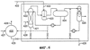 Истощенный растворитель амин также подают в блок очистки сжиженного нефтяного газа (СНГ), обозначенный прямоугольником 20 на фиг.1. Амин подают через поток 21 в противоточную колонну 22, в которую также подают газ СНГ через поток 23. Очищенный газ подают в мешалку 24 через поток 25, где он смешивается с дополнительным истощенным амином, подаваемым через поток 26, перед тем, как он пройдет в отстойник 27, где двухфазная смесь имеет возможность осаждаться. Часть удаленного использованного амина может быть подана обратно в колонну 22 через поток 28, но большая часть из нее проходит в блок 11 регенерации амина через поток 29. Использованный амин из колонны 22 также проходит непосредственно в блок 11 регенерации через поток 30. Поток газа из отстойника затем проходит в коагулятор 31 через поток 32. Очищенный газ затем отбирают через поток 33 и, может быть подвергнут дальнейшей очистке или использован непосредственно, если он соответствует. Поток жидкости 34 из коагулятора 31 частично рециркулирует в коагулятор через поток 35 и частично направляется в блок 11 регенерации через поток 36. Можно увидеть, что значительное количество амина используется один раз и впоследствии направляется непосредственно в блок регенерации. Это создает тяжелую нагрузку по жидкости на установку, которая контролируется насосами и клапанами (не показаны).