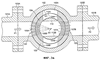 В дополнение к каналам, упомянутым выше, регулирующие элементы 104 и 105 имеют отверстия 104A, 104B и 105A, и 105B соответственно, диаметр которых соответствует диаметру трубы и отверстий 122 и 123. Эти отверстия имеют ось, находящуюся в основном под углом 90° к центральной оси соответствующих частей стенок с протоками. Эти отверстия 104A, 104B, 105A и 105B могут быть расположены на одной линии с отверстиями 122 и 123 для создания, по существу, свободного и прямого участка трубы. Деталь 112 сердечника типа пробки может быть выполнена так, чтобы герметично взаимодействовать с внутренней стороной регулирующего элемента 104 у наружной стенкой 112A детали сердечника. Через деталь сердечника 112 проходит отверстие 112B, которое предпочтительно находится на одной линии с входным отверстием 122 и выходным отверстием 123 и в котором предусмотрено такое же поперечное сечение потока.