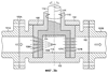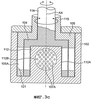 На фиг.3b и 3с показаны регулирующие элементы 104 и 105, имеющие коаксиальные шпиндели 114 и 115 соответственно, для контроля взаимного перемещения элементов относительно друг друга и корпуса. Регулирование относительных положений регулирующих элементов будет контролировать поток через мешалку. В одном крайнем положении проход через протоки будет полностью закрыт.