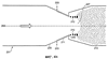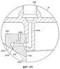 На фиг.4d изображено увеличенное поперечное сечение площади в пределах круга А на фиг.4c. На ней изображен более подробно проход жидкости через вход 223 потока жидкости. Жидкость проходит через проходы 223a и 223b к камере 223c, которая проходит вокруг периметра трубы. Затем жидкость подается через узкий проход 223d к внутренней поверхности конической секции 225 трубы. Проход 223d изображен очень узким и может иметь ширину порядка только 0,2 мм. Перепад давления в этом проходе тщательно контролируется и регулируется для обеспечения непрерывного потока жидкости с гомогенным распределением вокруг всего периметра трубы в сходящейся секции 225 трубы. Как указано выше, размер прохода 223d регулируется движением блоков 230 и 231. Пунктирная линия 225a показывает альтернативный наклон сходящейся секции 225 трубы, который дает более высокую скорость газовой фазы и, следовательно, улучшенное смешение, но увеличивает постоянный перепад давления в устройстве. Это изменение может быть произведено просто заменой одной части устройства на другую.