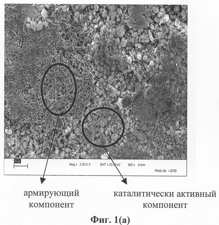 Фиг.1 (а) Данные электронной сканирующей микроскопии о характерной топологии теплопроводящего катализаторного тела.