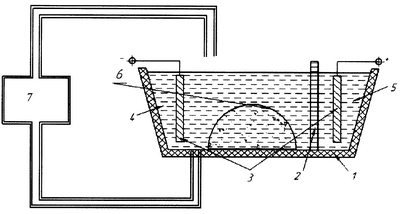 Ванна 1 для модификации и регенерации цеолитов разделена на две камеры перегородкой 2, имеющей свойства фильтра тонкой очистки воды, в обеих камерах имеются электроды 3, камера 4 содержит катод, в эту камеру загружают цеолиты 6 для модификации и регенерации, камера 5 содержит анод, имеется приспособление для обмывания в ванне цеолитов водными растворами солей.