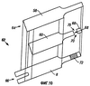 На фиг.8 показан предпочтительный способ выполнения головки экструдера изобретения. Здесь части (44) корпуса головки экструдера показаны расположенными на расстоянии друг от друга, вместе с необязательной прокладкой (36). Прокладка (36) включает прорези (46), обеспечивающие между частями корпуса головки экструдера каналы или канавки доставки жидкости к выпускным отверстиям (38) при сборке головки экструдера. Прокладка может включать PET, нержавеющую сталь или другой подходящий материал. Головка экструдера предпочтительно скреплена болтами вместе через отверстия (48), частично показанные пунктирными линиями. Также показаны частично пунктирными линиями каналы подачи жидкости (50), проходящие через корпус. Каналы заканчиваются у отверстий (52), расположенных для совмещения с прорезями в прокладке.
