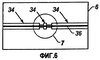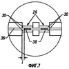 Сливные носики (30) с краями (32) показаны в совмещении. Эти элементы обеспечивают чистый выход раствора из головки экструдера для образования очень точной полоски раствора (10) на материале (8) ленты ткани. Позади сливных носиков (30) показана поверхность (34) головки экструдера. На фиг.5 эти элементы можно видеть в виде сверху.