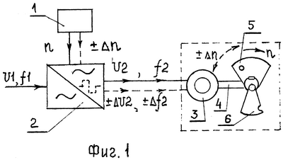 Регулируемый преобразователь частоты (РПЧ) 2 запитан от сети переменного тока с напряжением U1 и частотой f1; преобразователь выполнен с возможностью резкого изменения выходной частоты (f2± f2) и напряжения (U2± fU2) благодаря чему приводной асинхронный электродвигатель 3 создает управляющие импульсы положительного и отрицательного углового ускорения вала 4 в виде (n2± n), которые используются для перевода подвижного дебаланса из одного положении в другое.