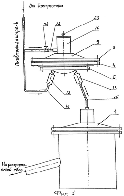 После этого цикл повторяется. Многократное повторение цикла обеспечит повышение давления в накопительной камере устройства в зависимости от отношения диаметров диафрагм 8 и 9. Отношения площадей этих диафрагм в пределах 1,3-3 выбраны по следующим причинам. Давление сжатого воздуха в пневмомагистрали на большинстве предприятий колеблется от 2,5 до 6 кгс/см2. Отношение площадей диафрагм в пределах 1,3 выбирается при давлении в пневмомагистрали около 6 кгс/см2. Тогда подаваемое давление в накопительную емкость пневмоустройства составит около 8 кгс/см2. При рабочем давлении в емкости не более 8 кгс/см2 пневмоимпульсное устройство не подлежит регистрации в органах Госкотлонадзора. Верхнее отношение 3 площадей диафрагм выбирается при давлении в пневмомагистрали предприятия около 2,5 кгс/см2. При давлении сжатого воздуха в накопительной камере устройства около 8 кгс/см2 при выхлопе на срезе выходного патрубка генерируется мощная волна давления, формирующая в слежавшемся материале интенсивные знакопеременные напряжения, эффективно разрушающие свод и разрыхляющие слежавшийся сыпучий материал.