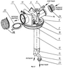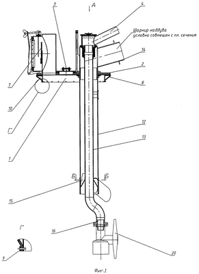 На фиг.1 и 2 показаны корпус крышки 1 с фланцем 2, в одно из отверстий которого вставлена заглушка 3, приспособление 4 для подвода моющего раствора, втулка с фланцем 5 для крепления опуска 6 на крышке, вертикальный лабиринт 7, эластичный кожух 8, прикрепленный лентой 9 с помощью заклепок к корпусу крышки 1, резиновая камера 10 с ниппелем 11 (фиг.3), наружная труба 12 опуска, внутренняя труба 13 опуска, приспособление 14 для подвода воздуха, патрубки отвода воздуха 15, трубчатые насадки 16, приспособление для крепления шланга выхлопного устройства 17, приспособление 18 для крепления подвеса 19, моечная головка 20.