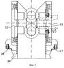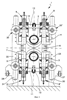 Соединительные тяги вертикальных и горизонтальных валков соединены друг с другом посредством четырех корпусов 22, 23, 24, 25, при этом два из них размещены на стороне управления, а два других корпуса находятся на стороне оператора и на них зафиксированы соединительные тяги. Корпусы предпочтительно предусматриваются с тележками 30, 31, скользящими по направляющим для облегчения перемещения корпусов и их технического обслуживания во время монтажа и демонтажа станины 1.