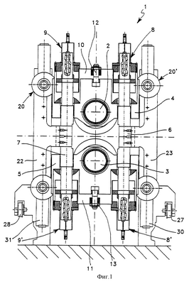Конкретно, обращая внимание на вышеупомянутые фигуры сопроводительных чертежей, можно видеть, что универсальная прокатная станина, в общем обозначенная ссылочной позицией 1, содержит два валка 2, 3 с горизонтальной осью, установленных на клиньях 4, 5, причем по два клина используются для каждого из горизонтальных валков, из которых на фиг.1 видны только те, которые размещены у одной боковой стороны станины. Других два клина, которые расположены на скрытой боковой стороне станины, представленной на фиг.1, являются абсолютно идентичными предшествующим валкам и далее подробно не описываются.