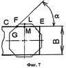 На фиг.6 показан 5-й вариант данного способа, а именно, слева толстой линией показана лента шириной В, а тонкой линией показан контур пуансона в виде замкнутого восьмиугольника для малоотходной вырубки из этой ленты заготовки без перемычек; справа толстой линией показана эта заготовка, полученная из ленты, например, в штампе для вырубки. Для широко распространенного случая вырубки заготовки в виде правильного восьмиугольника, когда В=А, сторона вырубленной заготовки равна A·tg( /8).