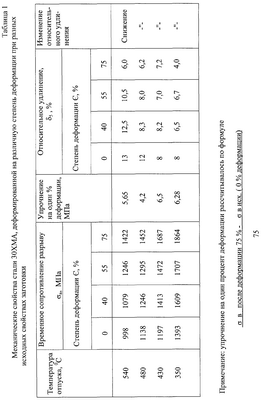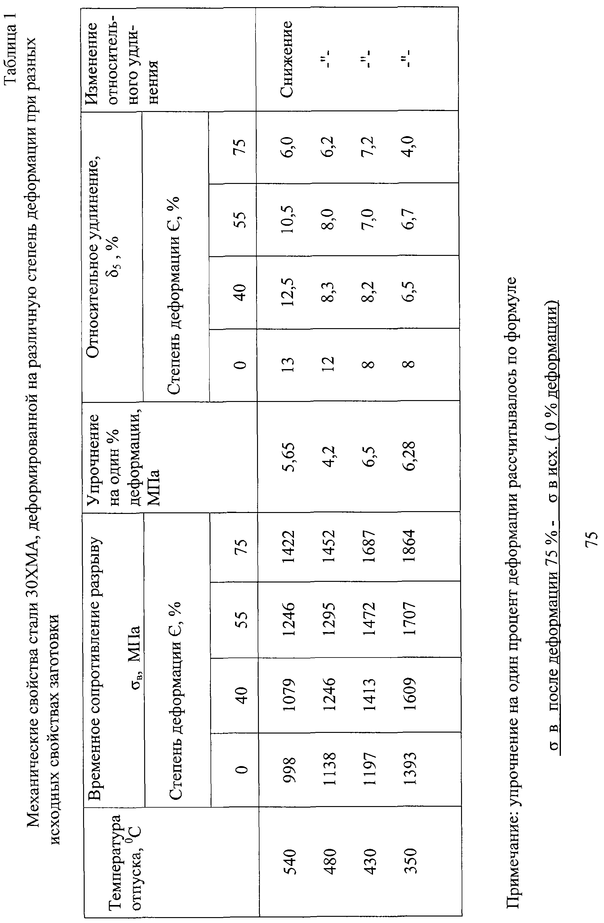 Настоящее изобретение относится к области обработки металлов давлением и может быть использовано при производстве осесимметричных корпусов, работающих по давлением, например корпусов двигателей реактивных снарядов для различных систем. Корпуса двигателей реактивных снарядов представляют собой тонкостенные цилиндрические оболочки с концевыми (а в отдельных случаях и с промежуточными) утолщениями, на которых нарезаются резьбы для соединения с головными и хвостовыми частями снаряда. Основными требованиями, предъявляемыми к корпусам двигателей, обусловленными условиями их эксплуатации (работе в условиях высоких давлений и температур), являются: – высокая конструктивная прочность; – минимальные весовые характеристики; – точность геометрической формы и размеров; – надежность функционирования в условиях импульсного (динамического) развития внутреннего давления и резкого повышения температур. С учетом вышеперечисленных требований к корпусам двигателей и их конструктивных особенностей осуществляется выбор исходного материала, типа заготовок, а также технологических способов их изготовления, включая состав технологических операций и их последовательность. Известен, например, способ изготовления корпусов двигателей из высокопрочных сталей мартенситного класса (А.С. №307167), схема технологического процесса при этом состоит из цикла операций по подготовке заготовок к пластической деформации (резка, калибровка, отжиг, механическая обработка по наружной и внутренней поверхности), цикла формообразующих операций ротационной вытяжки, а финальные механические свойства материала и необходимая конструктивная прочность корпусов достигается за счет финальной термической обработки (закалки и отпуска). Закалка как финальная термическая обработка отрицательно сказывается на точности геометрической формы изготавливаемых корпусов (овальность, кривизна и т.п.), что снижает эксплуатационные характеристики изделия в целом. Известен также способ изготовления оболочек из конструкционных сталей, работающих под внутренним давлением (патент РФ №2009215), заключающийся в том, что горячедеформированную трубу разрезают на мерные заготовки и обтачивают, предварительно деформируют ротационной вытяжкой, затем производят закалку и отпуск при 350…500°С, после чего окончательно деформируют ротационной вытяжкой со степенью 30…60%, а на финише проводят отжиг при 280…450°С. Данный способ является наиболее близким к заявляемому и выбран в качестве прототипа. Как видно, в указанном способе ротационная вытяжка разделена на два этапа: предварительный – до закалки и окончательный – после закалки с ограничением степени деформации до 60%. Ограничение обосновано тем, что при дальнейшем повышении степени деформации резко возрастает сопротивление материала пластической деформации и снижаются пластические характеристики: относительное удлинение и сужение материала. Кроме того, разделение деформации ротационной вытяжки на два этапа с промежуточной закалкой тонкостенных полуфабрикатов приводит к короблению и трудности посадки на оправку для окончательной деформации. Отсюда, как привило, полуфабрикаты должны проходить дополнительно процесс правки, что также увеличивает трудоемкость осуществления способа. Задача изобретения состояла в том