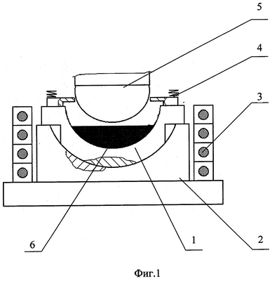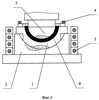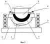 Вкладыш подшипника 1 (фиг.1) установлен в оснастке, имеющей нижнюю часть 2 и две боковые части (на фиг. не показаны), снабженной электронагревателем 3 и механизмом противодавления 4. Поз.5 обозначен пуансон. Поз.6 обозначен баббит.