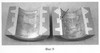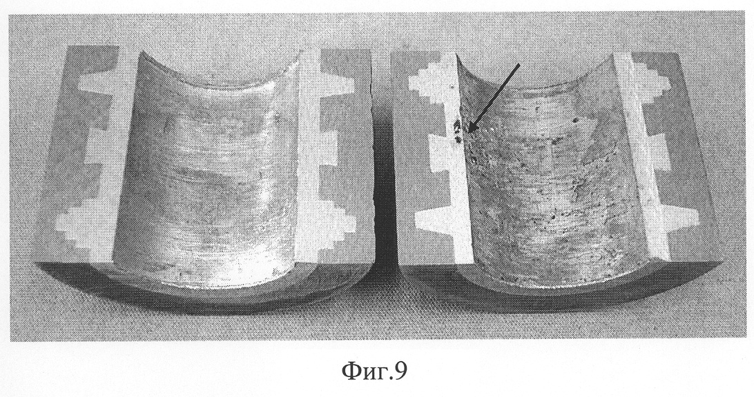 В данном примере распределение баббита, его охлаждение и деформацию провели за одну операцию. Такой прием позволил повысить производительность способа. Модельный образец подшипника с полученным вышеупомянутым образом антифрикционным слоем показан на фиг.9, где для сравнения показан модельный образец подшипника с антифрикционным слоем, полученным по способу [1]. Оба образца показаны до механической обработки. Хорошо заметна разница в качестве антифрикционного слоя. В частности, стрелкой показаны крупные поры в объеме и на поверхности антифрикционного слоя, полученного по способу [1].