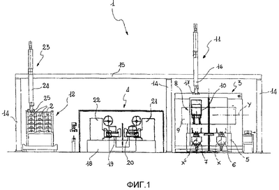 В связи с этим оборудование содержит второе устройство для загрузки/выгрузки детали, обозначенное как 23, которое конструктивно и функционально идентично устройству 11 и соответствующим образом включает в себя манипулятор 24 с загрузочно-разгрузочным элементом 25 для захвата колес 2. Так же как в случае устройства 11, устройство 23 направляется вдоль балки 15 для перемещения колес при осуществлении операций загрузки/вгрузки с удерживающих деталь устройств 19, 20 и взятия колес 2 из магазина 12 и переноса их в рабочую зону, предназначенную для операций обточки и наоборот.