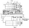 При сомкнутых кольцах 4-5 вращение от шпинделя 10 сообщается сомкнутым кольцам 4-5 и зажатой ими заготовке. При этом корпуса 9-12 и гидроцилиндры 13 остаются неподвижными.