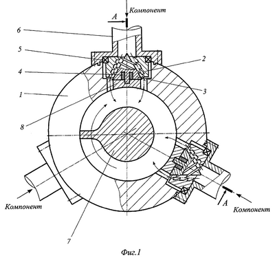 Расплавленный продукт поступает в зону дозирования, где происходит его транспортирование и дальнейшее сжатие шнеком 7. Одновременно в эту зону экструдера через подводящий трубопровод 6 в три радиально расположенных устройства подаются под давлением жидкие (вязкие) компоненты. При их движение через устройство для ввода компонентов втулка 2 и конусообразный питатель 3 за счет расположенных на их поверхности винтовых спиралей начинают свободно вращаться в подшипниках 4 и 5. При этом поток вводимого компонента начинает приобретать вращательное движение и при входе внутрь корпуса 1 он равномерно распределяется по всему сечению винтового канала шнека 7.