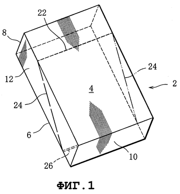 Пачка содержит корпус 2 в форме прямоугольного параллелепипеда. Корпус 2 имеет переднюю стенку 4, заднюю стенку 6, верхнюю стенку 8, нижнюю стенку 10 и правую и левую боковые стенки 12.