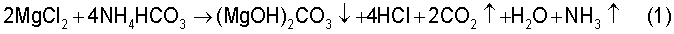 1. Способ получения оксида магния, включающий осаждение магнийсодержащего соединения из хлормагниевого водного раствора, фильтрацию, промывку и прокаливание осадка, отличающийся тем, что осаждение магнийсодержащего соединения проводят путем обработки хлормагниевого водного раствора с содержанием в нем хлорида магния 100-300 г/л бикарбонатом аммония или натрия, взятых в количестве 0,8-1,0 массы хлорида магния, полученную пульпу перемешивают в течение 0,25-1 ч, а прокаливание осадка осуществляют при температуре 600-850°С. 2. Способ по п.1, отличающийся тем, что хлормагниевый водный раствор готовят при использовании твердых отходов магнийтермического производства циркония. 3. Способ по п.1, отличающийся тем, что осаждение магнийсодержащего соединения проводят при температуре 60-75°С. 4. Способ по п.1, отличающийся тем, что промывку магнийсодержащего соединения осуществляют на фильтре водой при Т:Ж=1:6÷9. 5. Способ по п.1, отличающийся тем, что прокаливание осадка ведут в течение 1-3 ч. 6. Способ по п.2, отличающийся тем, что для повторного приготовления хлормагниевого водного раствора используют воду после промывки осадка. 7. Способ по п.1, отличающийся тем, что оставшийся после фильтрации раствор упаривают с получением хлористого натрия.