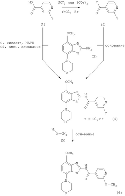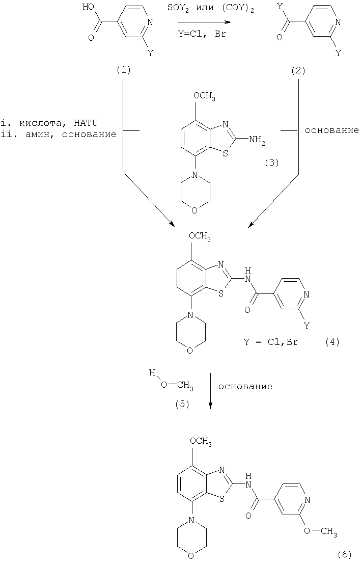 где R означает -С(O)-морфолинил, -(СН2)n-O-(низш.)алкил, -(CH2)nNR’2 или -C(O)NR’2, и при необходимости превращение полученных соединений в фармацевтически приемлемые кислотно-аддитивные соли. Получение соединений формулы I, где R означает фенил, пиридил, -С(O)O-(низш.)алкил или -С(O)-(низш.)алкил В первом способе соединения формулы I, где R означает фенил, пиридил, -С(O)O-(низш.)алкил или -С(O)-(низш.)алкил, получают из промежуточного соединения 2-метоксиизоникотинамида формулы (6), как показано ниже на схемах 1 и 2. Схема 1 На схеме 1 используются следующие сокращения: HATU означает гексафторфосфат O-(7-азабензотриазол-1-ил)-N,N,N’,N’-тетраметилмочевины Схема 2 На схеме 2 R означает фенил, пиридил, -С(O)O-(низш.)алкил или -С(O)-(низш.)алкил. Получение соединений формулы (2) Исходные соединения, 2-хлоризоникотиновая кислота или 2-бромизоникотиновая кислота формулы (1), являются коммерческими препаратами (например, поставляются фирмой Maybridge Chemicals) или их можно получить известными методами. Из 2-галогенизоникотиновой кислоты формулы (1) можно получить соответствующее производное ацилгалогенида формулы (2) при взаимодействии соединения формулы (1) с избытком галогенирующего агента, такого как оксалилхлорид или оксалилбромид, или тионилхлорид или тионилбромид, в присутствии катализатора, такого как N,N-диметилформамид или пиридин, в органическом растворителе, предпочтительно в дихлорметане или дихлорэтане, при комнатной температуре в течение 2-16 ч, предпочтительно в течение 16 ч. Продукт формулы (2) выделяют известными способами и предпочтительно используют на следующей стадии без дополнительной очистки. Получение соединений формулы (4) Исходное соединение, 2-аминобензотиазол формулы (3), можно получить по методам, описанным в ЕР 00113219.0. Соединения формулы (4) получают при взаимодействии 2-аминобензотиазола формулы (3) с небольшим избытком ацилгалогенида формулы (2) в апротонном органическом растворителе, предпочтительно в смеси дихлометана и тетрагидрофурана, содержащей основание, предпочтительно N-этилдиизопропиламин или триэтиламин, при комнатной температуре в течение 2-24 ч, предпочтительно в течение 24 ч. Продукт формулы (4) выделяют известными способами и предпочтительно очищают хроматографией или перекристаллизацией. Альтернативные способы получения соединений формулы (4) Соединения формулы (4) можно также получить непосредственно из соединений формулы (1). В этом случае соединение формулы (1) обрабатывают стехиометрическим количеством конденсирующего агента (используемого в химии пептидов), предпочтительно гексафторфосфата O-(7-азабензотриазол-1-ил)-N,N,N’,N’-тетраметилмочевины (HATU), в эфирном растворителе, предпочтительно в тетрагидрофуране, содержащем основание, предпочтительно N-этилдиизопропиламин, при комнатной температуре в течение 30-90 мин. Затем полученную смесь обрабатывают 2-аминобензотиазолом формулы (3) в смеси растворителей, предпочтительно в смеси тетрагидрофурана, диоксана и N,N-диметилформамида, при комнатной температуре в течение 16-24 ч, предпочтительно 24 ч. Продукт формулы (4) выделяют известными способами и предпочтительно очищают хроматографией или перекристаллизацией. Получение соединений формулы (6) Первым способом получения соединений формулы (6) является взаимодействие соединения формулы (4) с избытком метанола в присутствии гидрида металла, предпоч