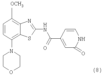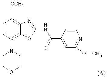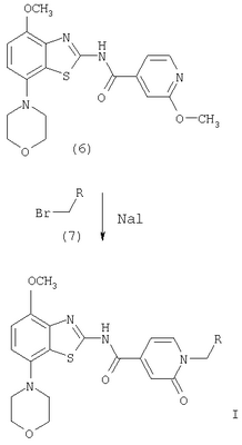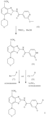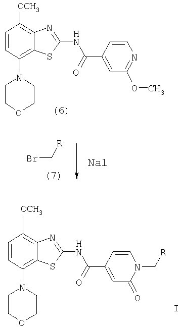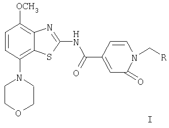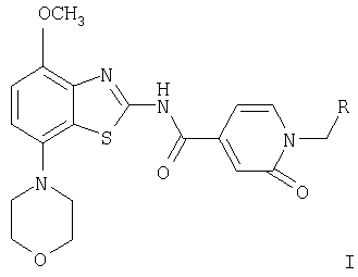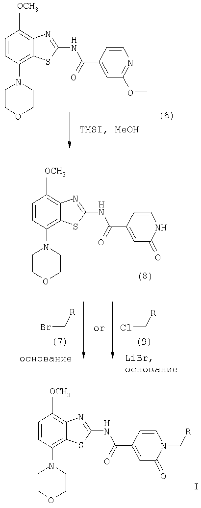 Методика получения 1. Компоненты 1, 2, 3 смешивают в соответствующем смесителе в течение 30 мин. 2. Добавляют компоненты 4 и 5 и перемешивают в течение 3 мин. 3. Смесью заполняют соответствующие капсулы. Изобретение иллюстрируется следующими примерами, не ограничивающими его объем. Пример 1 (4-Метокси-7-морфолин-4-илбензотиазол-2-ил)амид 1-бензил-2-оксо-1,2-дигидропиридин-4-карбоновой кислоты К раствору 85 мг (0,21 ммоля) 2-метокси-N-(4-метокси-7-морфолин-4-илбензотиазол-2-ил)изоникотинамида в 2 мл ацетонитрила при перемешивании добавляли 73 мг (0,43 ммоля) иодида натрия, 0,05 мл (0,43 ммоля) бензилбромида и смесь кипятили с обратным холодильником в течение 16 ч. Затем реакционную смесь охлаждали до комнатной температуры, разбавляли этилацетатом и последовательно промывали водой и солевым раствором. Органическую фазу сушили над сульфатом натрия и концентировали в вакууме. Продукт очищали экспресс-хроматографией (элюент: этилацетат/толуол, 2:1), при этом получали 32 мг (32%) (4-метокси-7-морфолин-4-илбензотиазол-2-ил)амида 1-бензил-2-оксо-1,2-дигидропиридин-4-карбоновой кислоты в виде кристаллов желтого цвета. МС (ES): m/e (%) 499 (М+Na+, 14), 477 (M+H+, 100). Следующие соединения получали аналогично тому, как описано в примере 1. Пример 2 Этиловый эфир [4-(4-метокси-7-морфолин-4-илбензотиазол-2-илкарбамоил)-2-оксо-2Н-пиридин-1-ил]уксусной кислоты Указанное соединение получали при взаимодействии 2-метокси-N-(4-метокси-7-морфолин-4-илбензотиазол-2-ил)изоникотинамида с иодидом натрия и этиловым эфиром бромуксусной кислоты в ДМФА. МС (ES): m/e (%) 495 (M+Na+, 25), 473 (M+H+, 100). Пример 3 (4-Метокси-7-морфолин-4-илбензотиазол-2-ил)амид 2-оксо-1-(2-оксобутил)-1,2-дигидропиридин-4-карбоновой кислоты Указанное соединение получали при взаимодействии 2-метокси-N-(4-метокси-7-морфолин-4-илбензотиазол-2-ил)изоникотинамида с иодидом натрия и 1-бром-2-бутаноном в ДМФА. МС (ES): m/e (%) 479 (M+Na+, 32), 457 (M+H+, 100). Пример 4 (4-Метокси-7-морфолин-4-илбензотиазол-2-ил)амид 2-оксо-1-пиридин-2-илметил-1,2-дигидропиридин-4-карбоновой кислоты Указанное соединение получали при взаимодействии 2-метокси-N-(4-метокси-7-морфолин-4-илбензотиазол-2-ил)изоникотинамида с иодидом натрия и гидробромидом 2-(бромэтил)пиридина в ДМФА. МС (ES): m/e (%) 500 (M+Na, 30), 478 (M+H+, 100). Пример 5 (4-Метокси-7-морфолин-4-илбензотиазол-2-ил)амид 1-(2-морфолин-4-ил-2-оксоэтил)-2-оксо-1,2-дигидропиридин-4-карбоновой кислоты К раствору 200 мг (0,52 ммоля) (4-метокси-7-морфолин-4-илбензотиазол-2-ил)амида 2-оксо-1,2-дигидропиридин-4-карбоновой кислоты в 1 мл ДМФА и 4 мл 1,2-диметоксиэтана при перемешивании добавляли 44 мг (1,04 ммоля) гидрида натрия (60% дисперсия в минеральном масле). После перемешивания при комнатной температуре в течение 15 мин добавляли 90 мг (1,04 ммоля) бромида лития и перемешивали в течение еще 15 мин. Затем добавляли 95 мг (0,58 ммоля) 4-(2-хлорацетил)морфолина и смесь перемешивали при комнатной температуре в течение 16 ч. Реакционную смесь разбавляли этилацетатом и последовательно промывали 0,5 М соляной кислотой, насыщенным раствором бикарбоната натрия и солевым раствором. Объединенную водную фазу фильтровали, осадок на фильтре промывали эфиром, ресуспендировали в толуоле и концентрировали в вакууме. Продукт очищали экспресс-хроматографией (элюент: MeOH/CH2Cl2) и растирали в этилацетате, при этом получали 83 мг (31%) (4-метокси-7-морфолин-4-илбензотиазол-2-ил)амид 1-(2-морфолин-4-ил-2-оксоэтил)-2-оксо-1,2-дигидропиридин-4-карбоновой кислоты в виде кри