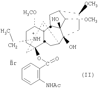 обладающему антиаритмической активностью. Указанное свойство позволяет предполагать возможность использования соединения (I) в медицине в качестве фармацевтического препарата. В настоящее время достигнуты значительные успехи в разработке антиаритмических препаратов, относящихся к различным классам химических соединений. Относительно большой набор таких препаратов необходим для усовершенствования терапии и профилактики различного рода нарушений ритма сердца. Аналогом по свойствам и по структуре заявляемого соединения является препарат аллапинин (II), относящийся к группе мембраностабилизирующих средств и применяемый в медицинской практике в качестве антиаритмического агента с 1987 г. [1-8]. По химической структуре аллапинин представляет собой гидробромид лаппаконитина (III), алкалоида с аконитановым скелетом, выделяемого из воздушно-сухих корней борца северного Aconitum septentrionale Koelle и ряда родственных борцов. Многолетние клинические исследования показали высокую противоаритмическую эффективность аллапинина при лечении больных с желудочковыми и наджелудочковыми экстрасистолиями, пароксизмами мерцания и трепетания предсердий, пароксизмальной желудочковой и наджелудочковой тахикардией, в том числе при синдроме Вольфа-Паркинсона-Уайта [7]. Обнаружено также психотропное [9] и обезболивающее [10] действие лаппаконитина.