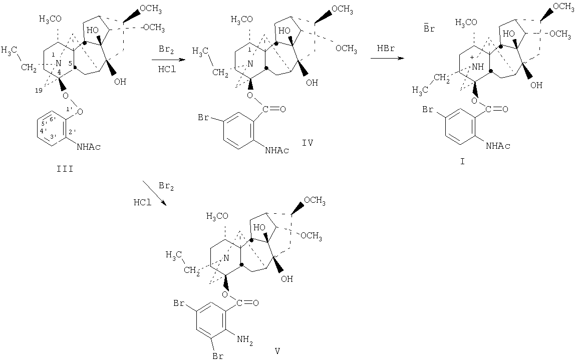 Из данных табл.2 видно, что гидробромид 5′-бромлаппаконитина (I) в дозах 0,330 мг/кг и 0,033 мг/кг предотвращает и блокирует развитие адреналиновой аритмии, восстанавливая показатели ЭКГ до нормы в 100% случаях. Эталон сравнения – препарат аллапинин (II) в дозе 0,290 мг/кг предотвращает развитие адреналиновой аритмии на 80%, а блокирует ее развитие только в 20% случаев. Таким образом, новое соединение – гидробромид 5′-лаппаконитана (I) обладает выраженной антиаритмической активностью, предотвращает развитие хлоридкальциевой и адреналиновой аритмии, при введении в дозе на порядок ниже терапевтической дозы используемого в медицинской практике препарата аллапинина. Заявляемое соединение имеет в 4,8 раза более низкую токсичность, чем аллапинин. Указанное соединение получается достаточно простым технологичным способом на основе доступного растительного алкалоида лаппаконитина. Данное изобретение иллюстрируется примерами. Пример 1. Получение 4- Приготовление раствора А. К 57 мл конц. соляной кислоты (d=1,19) прибавляют порциями при перемешивании 22,4 г (38,3 ммоля) порошкообразного лаппаконитина, при этом происходит слабая экзотермическая реакция и образование геля. Гель растворяют при перемешивании в течение 45 мин. Приготовление раствора Б. К навеске 7,38 г (46,2 ммоля) Br2 приливают 45 мл конц. соляной кислоты (d=1,19) при активном перемешивании. Бромирование. Раствор Б прибавляют порциями ( Т.пл. 202-204°С. Найдено, %: С 57.55; Н 6.73; Br 12.40; N 4.41. С32Н43BrN2O8. Вычислено, %: С 57.92; Н 6.53; Br 12.04; N 4.22. Спектр ЯМР 1H (CDCl3, 400.13 МГц, Спектр ЯМР 13С ( ИК-спектр (KBr), Осадок технического дибромида (V) промывают на фильтре горячим спиртом, высушивают и перекристаллизовывают из бензола. Получают 0,97 г (выход 4%) чистого соединения (V), т.пл. 255-260°С (с разл.). Найдено, %: С 51.55; Н, 5.80; Br 22.49; N 4.10. С30Н40Br2N2О7. Вычислено, %: С 51.44; Н 5.76; Br 22.82; N, 4.00. Спектр ЯМР 1H (CDCl3, 400.13 МГц, Спектр ЯМР 13С ( ИК-спектр (KBr), Пример 2. Гидробромид 5′-бромлаппаконитина (I). К раствору 1,11 г (1,67 ммоля) основания (IV) в 2,5 мл СН3Cl2 добавляют по каплям при перемешивании раствор 0,295 г (1,70 ммоль) 46%-ной HBr в 5,0 мл 95%-ного EtOH (мольное соотношение соединение (IV) / HBr=1:1,02) (до рН 4). Растворитель отгоняют в вакууме при 50°С/30 Торр, смолистый остаток растирают с 5 мл эфира, получают кристаллический бесцветный порошок. Суспензию в эфире оставляют герметично закрытой на 15 ч. Осадок соли отфильтровывают, промывают эфиром, высушивают на воздухе. Получают 1,25 г соли (I) (выход 99%). Т.пл. 208-210°С (с разл.). Найдено, %: Br (ионный) 11.04. С32Н43BrN2O8·HBr. Вычислено, %: Br (ионный), 10.74. Спектр ЯМР H1 (D2O, 400.13 МГц, ИК-спектр (KBr), Пример 3. Оценка антиаритмической активности гидробромида 5′-бром-лаппаконитина (I) на модели хлоридкальциевой аритмии. Опыты проводили на нормотензивных, наркотизированных тиопенталом натрия (в дозе 30 мг/кг внутрибрюшинно) половозрелых крысах самцах массой 190-220 г. Аритмия вызывалась путем однократного введения в бедренную вену 10%-ного раствора CaCl2 (250 мг/кг; данная концентрация CaCl2 является летальной для крыс в 100% случаях). Для оценки антиаритмической активности использовали две схемы эксперимента: введение CaCl2 до и после введения исследуемого агента. На протяжении всего эксперимента (10 мин) ЭКГ записывали во втором стандартном отведении и регистрировали показатели на приборе фирмы “Coulboum instruments” (США.). Оценивали параметры ЭКГ – частоту сердечных сокращений и амплитуду пика зубца (RR). Обра