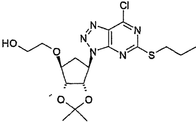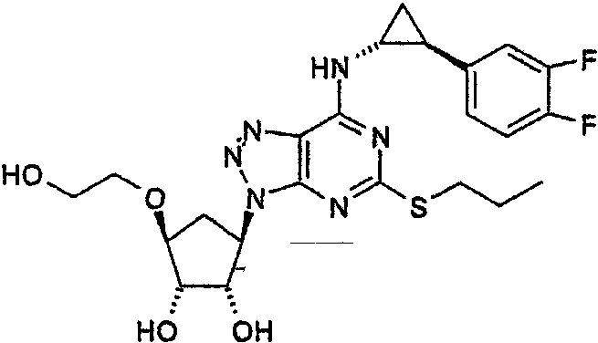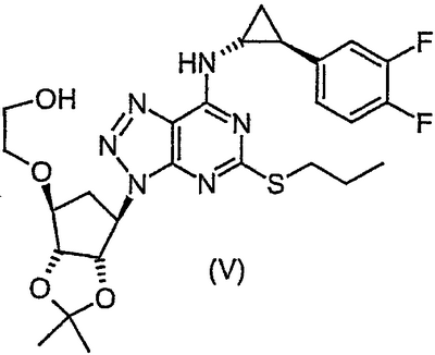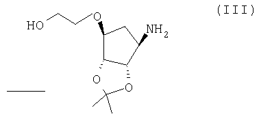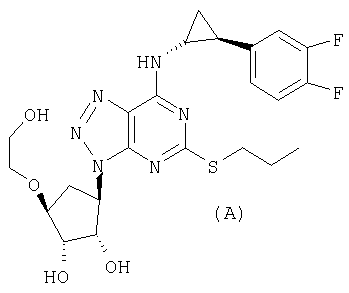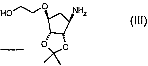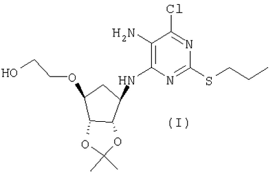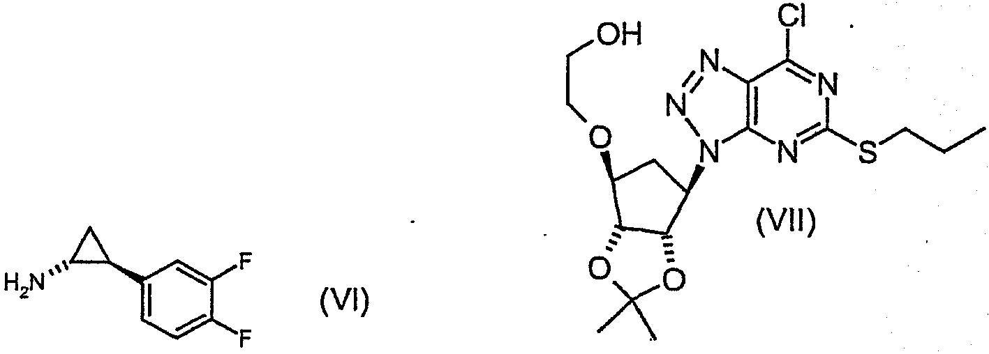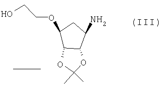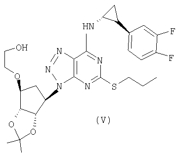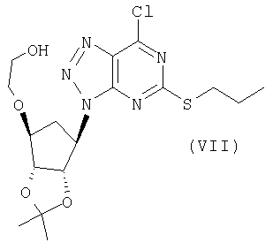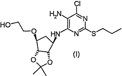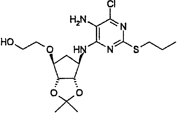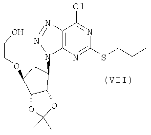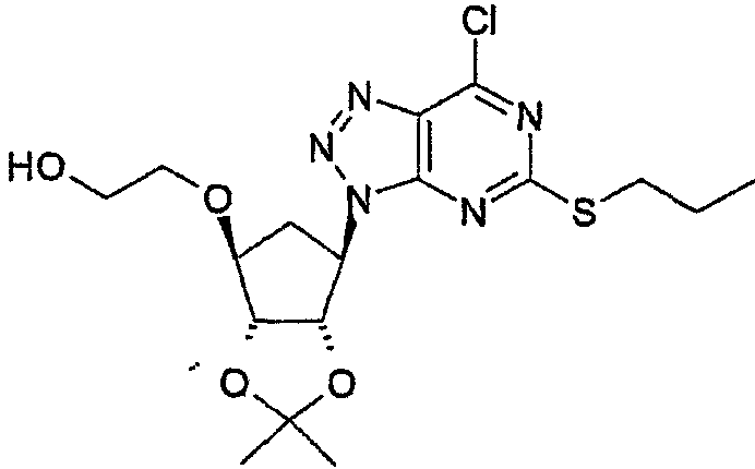 Пиридин (2,58 мл) добавляли к перемешиваемой, нагретой (70°С) суспензии 4,6-дигидрокси-5-[(E)-2-(4-метилфенил)диазенил]-2-(пропилсульфанил)пиримидина (стадия 2, 5 г) в толуоле (15 мл). К смеси добавляли по каплям хлорокись фосфора (18,7 мл) в течение 15 мин (повышение температуры до 94°С). Реакционную смесь нагревали в течение еще 4,5 ч, затем упаривали. Остаток дважды подвергали азеотропной отгонке с толуолом (2×30 мл). Остаток растворяли в толуоле (50 мл) и фильтровали для удаления твердых частиц. Собранное твердое вещество растворяли в толуоле (50 мл) и фильтровали для удаления некоторых твердых частиц. Собранное твердое вещество промывали толуолом и объединенные фильтраты промывали водой (30 мл) и насыщенным водным раствором бикарбоната натрия (30 мл). Выпаривание давало указанный в заголовке продукт (4,98 г) в виде красного масла, которое медленно кристаллизовалось при стоянии. Стадия 4: получение 4,6-дихлор-2-(пропилсульфанил)-5-пиримидинамина. Перемешиваемый раствор 4,6-дихлор-5-[(E)-2-(4-метилфенил)диазенил]-2-(пропилсульфанил)пиримидина (стадия 3, 1,1 кг) в 2-пропаноле (16,6 кг) гидрировали в течение 1 ч при 40°С/3,2 бар над катализатором платиной на угле (0,81 кг, 50% мас./мас. Pt/С). Находящийся под давлением газообразный водород выпускали и реактор наполняли азотом. Реакционную смесь фильтровали. Собранное твердое вещество промывали 2-пропанолом (1,7 кг) и объединенные фильтраты концентрировали при пониженном давлении. Оставшееся масло охлаждали до 20°С и растворяли в этилацетате (5 кг) и добавляли воду (5,5 л). Значение рН перемешанной смеси доводили до рН 2 добавлением 3 М водного раствора соляной кислоты (800 мл). Фазам давали разделиться и водную фазу отбрасывали. Добавляли воду (2,75 л) к органической фазе и рН доводили до 2 добавлением небольшого количества 3 М HCl (45 мл). Водную фазу отделяли и органическую фазу концентрировали при пониженном давлении при 30 – 50°С с получением 4,6-дихлор-2-(пропилсульфанил)-5-пиримидинамина в виде красноватого вязкого масла, содержащего этилацетат, которое растворяли в этаноле (8,5 кг). Затем растворитель (6,5 л этанола/этилацетата) удаляли выпариванием при пониженном давлении. К остатку добавляли еще порцию этанола (4,5 кг) и выпаривание повторяли для удаления 6,5 л растворителя. Этанольный раствор продукта использовали без дополнительной очистки на следующей стадии. ПРИМЕР 4 Данный пример показывает получение [1S-[1 Стадия 1: получение [(3aR-(3а Этанольный раствор 4,6-дихлор-2-(пропилсульфанил)-5-пиримидинамина (полученного как в примере 3, стадия 4) добавляли к 2-{[(3aR,4S,6R,6aS)-6-амино-2,2-диметилтетрагидро-3аН-циклопента[d][1,3]диоксол-4-ил]окси}-1-этанолу, соль L-винной кислоты (1:1) (1,18 кг). К полученной перемешиваемой густой суспензии добавляли триэтиламин (0,95 кг), поддерживая температуру между 20 и 25°С. Реактор герметизировали и температуру повышали до 120 – 125°С. Реакционную смесь выдерживали при данном интервале температуры в течение 30 ч, затем охлаждали до 75°С и давление сбрасывали. Температуру смеси доводили до 50°С и растворитель отгоняли при пониженном давлении при 30 – 40°С. Добавляли этилацетат (4,95 кг) и воду (5,5 л), рН смеси доводили до рН 5 добавлением 3 М соляной кислоты (100 мл) и фазы разделяли. Органическую фазу промывали 15% рассолом мас./мас. (5,5 л), затем отделяли. Органическую фазу концентрировали при пониженном давлении (4,81 л растворителя удаляется) с получением 2-[((3aR,4S,6R,6a