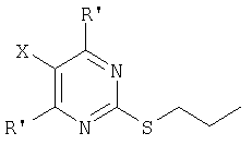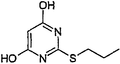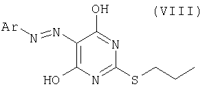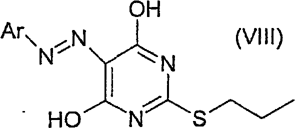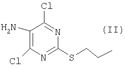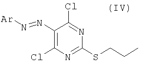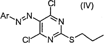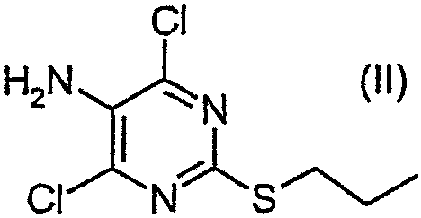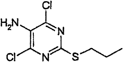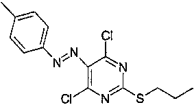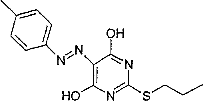 Воду (670 мл) добавляли к 2-тиобарбитуровой кислоте (200 г). Полученную смесь перемешивали и добавляли порциями гидроокись натрия (126,3 г). Смесь перемешивали в течение 40 мин, затем разбавляли водой. Добавляли 1-метил-2-пирролидинон (400 мл) и 1-иодпропан (140,9 мл). Полученную суспензию перемешивали при 20°С в течение 22 ч. Значение рН смеси доводили до 6,5 добавлением 1 М HCl (600 мл) в течение 30 мин, затем до рН 2,5 добавлением 6 М HCl (180 мл) в течение еще 30 мин. Полученную суспензию перемешивали в течение 18 ч и продукт выделяли фильтрованием и последовательно промывали водой (4×100 мл), этанолом (200 мл) и водой (2×200 мл). Продукт высушивали при пониженном давлении в течение ночи при 50°С с получением указанного в заголовке продукта в виде белого порошка (185 г). Стадия 2: 4,6-Дигидрокси-5-[(E)-2-(4-метилфенил)диазенил]-2-(пропилсульфанил)пиримидин. Этанол (25 мл), 4,6-дигидрокси-2-(пропилсульфанил)пиримидин (стадия 1, 5 г) и воду (25 мл) перемешивали вместе при комнатной температуре. Добавляли гидроокись натрия (1,02 г) и получали прозрачный раствор. Полученный раствор охлаждали до 0°С и затем добавляли ацетат натрия (9,42 г) с получением раствора А. В отдельной емкости готовили раствор п-толуидина (3,01 г) в воде (10 мл). К нему добавляли концентрированную соляную кислоту (37% мас./мас. водный раствор, 8,45 мл). Полученную смесь охлаждали до 0°С, и раствор нитрита натрия (2,16 г) в воде (10 мл) охлаждали до 0°С, и добавляли по каплям к содержащей толуидин реакционной смеси в течение 30 мин. Температуру во время добавления поддерживали между 0 и 5°С. Полученную смесь охлаждали до 0°С и добавляли к холодному (0°С) раствору А (температура поднималась до 8°С). Полученную желтую суспензию перемешивали в течение ночи и рН смеси доводили до рН 1 добавлением 6 М HCl. Смесь фильтровали и собранный продукт промывали водой (25 мл) и этанолом (10 мл). Продукт высушивали при пониженном давлении при 50°С в течение 24 ч с получением продукта в виде желтого твердого вещества (6,97 г). Стадия 3: 4,6-Дихлор-5-[(E)-2-(4-метилфенил)диазенил]-2-(пропилсульфанил)пиримидин.