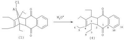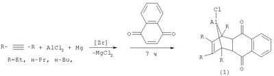 : AlCl3 : Mg : Cp2ZrCl2 равном 20:12:12:0.5 в атмосфере аргона при комнатной температуре (20°С) и атмосферном давлении в тетрагидрофуране (ТГФ) в качестве растворителя в течение 8 часов с последующим добавлением 1,4-нафтахинона в эквимольном по отношению к AlCl3 количестве с перемешиванием реакционной массы в течение 6-8 часов, предпочтительно 7 часов, при комнатной температуре (20°С). Реакция протекает с образованием 15-хлоро-1,12,13,14-тетраалкил-15-алюминатетрацикло[10.2.1.02,11.04,9]пентадека-4(9),5,7,13-тетраен-3,10-дионов (1) с выходом 64-75% по схеме: