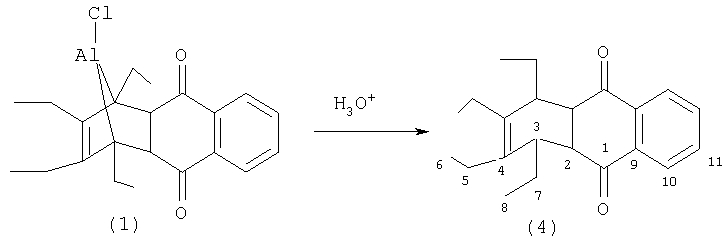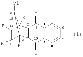 Предлагаемые соединения могут найти применение в тонком и металлоорганическом синтезе, а также в качестве сокатализаторов в процессах олиго- и полимеризации олефинов и сопряженных диенов. Известен способ [1, У.М.Джемилев, А.Г.Ибрагимов, А.П.Золотарев, P.P.Маслухов, Г.А.Толстиков. Синтез и превращения металлоциклов. Сообщение 5. Региоселективный синтез Известный способ не позволяет получать 15-хлоро-1,12,13,14-тетраалкил-15-алюминатетрацикло[10.2.1.02,1104,9]пентадека-4(9),5,7,13-тетраен-3,10-дионы (1). Известен способ [2, У.М.Джемилев, А.Г.Ибрагимов, Л.О.Хафизова, Л.Р.Якупова, Л.М.Халилов. Циклоалюминирование ацетиленов и 1,4-енинов с участием Zr-содержащих катализаторов. Журнал органической химии, 2005, 41, 684] получения циклических алюминийорганических соединений (3) взаимодействием дизамещенных ацетиленов с этилалюминийдихлоридом (EtAlCl2) в присутствии катализатора цирконацендихлорида (Cp2ZrCl2) с последующим добавлением малеинового ангидрида при температуре 25°С по схеме: Известным способом не могут быть получены 15-хлоро-1,12,13,14-тетраалкил-15-алюминатетрацикло[10.2.1.02,11.04,9]пентадека-4(9),5,7,13-тетраен-3,10-дионы (1). Таким образом, в литературе отсутствуют сведения по селективному получению 15-хлоро-1,12,13,14-тетраалкил-15-алюминатетрацикло[10.2.1.02,11.04,9]пентадека-4(9),5,7,13-тетраен-3,10-дионов (1). Предлагается новый способ получения 15-хлоро-1,12,13,14-тетраалкил-15-алюминатетрацикло[10.2.1.02,11.04,9]пентадека-4(9),5,7,13-тетраен-3,10-дионов (1). Сущность способа заключается во взаимодействии диалкилзамещенных ацетиленов общей формулы 15-Хлоро-1,12,13,14-тетраалкил-15-алюминатетрацикло-[10.2.1.02,11.04,9]пентадека-4(9),5,7,13-тетраен-3,10-дионы (1) образуются только лишь с участием AlCl3, дизамещенных ацетиленов, металлического Mg, циркониевого катализатора Cp2ZrCl2 и 1,4-нафтахинона. В присутствии других соединений алюминия (например, AlEt3, Bui 3Al, Bui 2AlH), других ацетиленов (например, терминальных), других металлов в качестве акцептора галогенид-ионов (например, Zn, Fe, Al), других катализаторов (например, Zr(acac)4, Cp2TiCl2, Pd(acac)2, Ni(acac)2, NiCl2, Fe(acac)2), других дикетонов (например, о-бензохинон или 9,10-антрахинон), целевые продукты (1) не образуются. Реакцию проводили при комнатной температуре (20°С). При более высокой температуре (например, 40°С) не наблюдается существенного увеличения выхода целевых продуктов (1), а при меньшей температуре (например, 0°С) снижается скорость реакции. Изменение соотношения исходных реагентов (AlCl3, Mg, 1,4-нафтахинон) и катализатора (Cp2ZrCl2) в сторону их увеличения по отношению к исходному дизамещенному ацетилену Реакцию проводили с использованием ТГФ в качестве растворителя. В других растворителях (например, алифатических или ароматических) реакция не идет. Существенные отличия предлагаемого способа. В предлагаемом способе для получения циклических кислородсодержащих АОС используются в качестве исходных соединений соль – треххлористый алюминий (AlCl3) и 1,4-нафтахинон, а в известном способе – алюминийорганическое соединение этилалюминийдихлорид (EtAlCl2) и малеиновый ангидрид. Предлагаемый способ обладает следующими преимуществами. Способ позволяет получать с высокой селективностью 15-хлоро-1,12,13,14-тетраалкил-15-алюминатетрацикло[10.2.1.02,11.04,9]пентадека-4(9),5,7,13-тетраен-3,10-дионы (1), синтез которых в литературе не описан. Способ поясняется следующими примерами. Пример 1. В стеклянный реактор объемом 50 мл, установленный на магнитной мешалке, в