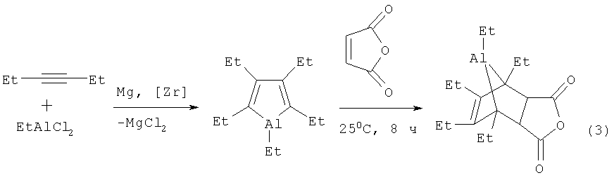 где R=Et, н-Pr, н-Bu, взаимодействуют с треххлористым алюминием AlCl3 в присутствии металлического Mg (порошок) и катализатора цирконацендихлорида (Cp2ZrCl2) в мольном соотношении