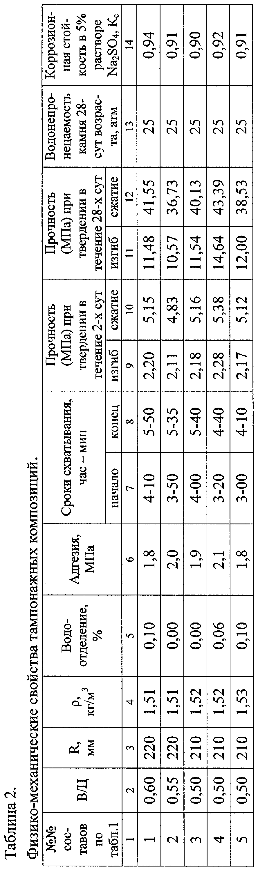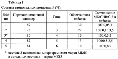Пример осуществления изобретения. Для приготовления тампонажного материала используют портландцементный клинкер, природный гипсовый камень, микрокремнезем марок МК85 или МК65, абиетат натрия в виде смолы нейтрализованной воздухововлекающей – СНВ по ТУ 81-05-75-74 или его зарубежного аналога UfaCem, суперпластификатор С-3 по ТУ 6-14-625-80. Портландцементный клинкер и гипсовый камень измельчают до дисперсности, характеризуемой остатком на сите №008 20-25%, затем добавляют предварительно перемешанную с сухом виде смесь микрокремнезема, СНВ и С-3 в указанных соотношениях и измельчают весь материал до дисперсности, характеризуемой остатком на сите №008 8-12%. Полученный тампонажный материал перемешивают с водой в соотношении тампонажный материал:вода от 1:0,5 до 1:0,7 перед началом цементирования скважин. Сочетание указанных компонентов в составе облегчающей добавки эффективно только при использовании в качестве воздухововлекающего реагента абиетата натрия, т.к. в этом случае обеспечивается стабилизация плотности, повышение седиментационной устойчивости и улучшение адгезионных свойств. Составы тампонажных материалов и их свойства приведены в табл.1 и 2. Как следует из таблиц, полученный по изобретению тампонажный материал имеет высокую коррозионную стойкость, водонепронецаемость и соответственно долговечность.