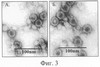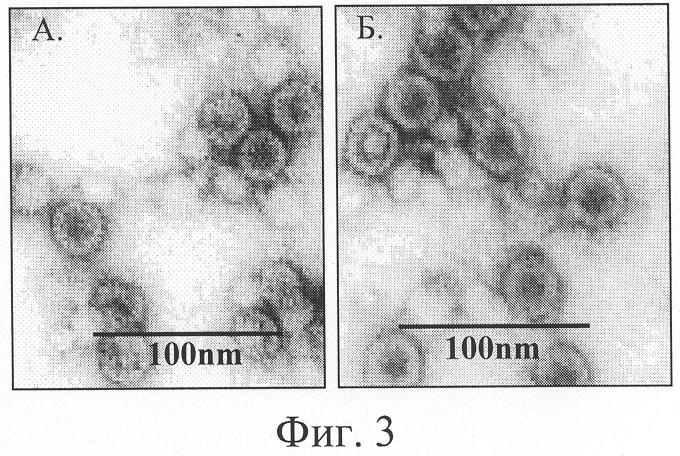 Фиг.3. Электронная фотография рекомбинантных белков HBcAg (Фиг.3А) и HBcAg-preS1 (Фиг.3Б). Препараты HBcAg готовят методом негативного контрастирования 2%-ным раствором фосфорно-вольфрамовой кислоты и исследуют в электронном микроскопе “JEM 100C”.
