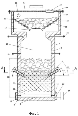 Как показано на фиг.1, установка включает в себя реактор, корпус 1 которого выполнен из листовой стали. Корпус 1 футерован огнеупорным материалом 2. В нижней части реактора размещается плавильная зона 3, оборудованная средствами подачи энергоносителя и восстановителя через плазмотроны 4 непосредственно в плавильную зону 3. Над слоем проплавляемого материала установлены форсунки 5 подачи кислородсодержащего газа для дожигания горючего газа, выходящего из плавильной зоны. У основания пода 6 расположено выпускное отверстие 7, оснащенное шиберным затвором 8. В верхней части реактора размещается устройство 9 предварительного восстановления окисных материалов, расположенное в стальном футерованом корпусе 10. Внутри корпуса 10 размещается перфорированный бункер 11, выполненный из жаропрочной стали. В нижней части бункера 11 выполнено выпускное отверстие 12 подачи предварительно восстановленных материалов в плавильную зону 3, оснащенное конусным запорным механизмом 13. В верхней части устройства предварительного восстановления 9 размещается загрузочное устройство 14 для подачи окисных материалов в реактор, оснащенное герметичной крышкой 15. В устройстве предварительного восстановления установлена система 16 для удаления отработанных газов из реактора. Бункер 11 сверху закрыт герметичной крышкой 17. Внутренние стенки реактора образуют канал 18, который в верхней части выполнен сужающимся. Канал 18 соединяет устройство 9 предварительного восстановления в нижней его части с плавильной зоной 3. В сужающейся части канала 18 установлены форсунки 19 для дополнительной подачи восстановителя (например, природного газа) и/или водяного пара. Плазмотроны 4 установлены на высоте 0,5-0,8 Н от пода плавильной зоны, где Н – общая высота загрузки материала, противоположно по периметру реактора под углом 30-50° к горизонту в направлении пода реактора таким образом, что продольные оси симметрично расположенных плазмотронов пересекаются на оси реактора с вершиной угла осей, расположенной выше предварительно заданной высоты зеркала металла. Плазмотроны 4 герметично присоединяются к реактору через фланцы 20 (фиг.2). В нижней части реактора размещен копильник 21 восстановленного металла. У дна 6 копильника (реактора) напротив выпускного отверстия 7 выполнено дополнительное отверстие 22, к которому через шиберный затвор 23 подсоединен дополнительный продувочно-рафинировочный плазмотрон 24, продольная ось которого параллельна дну копильника.