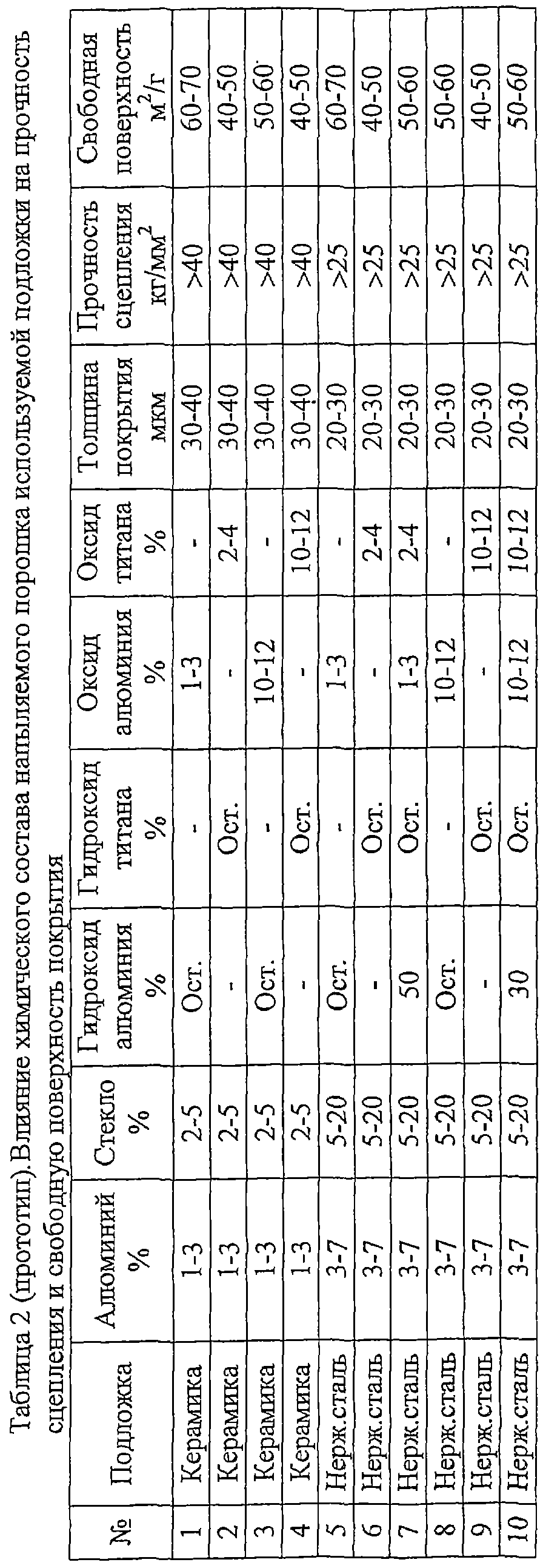 Все эти меры, однако, сильно усложняют технологический процесс, что делает его весьма нестабильным и трудно воспроизводимым. Кроме того, одна из основных характеристик напыляемого покрытия – величина свободной поверхности, имеет весьма низкие значения (см. Таблицы 2, 3 Прототипа), а именно 60-80 м2/г, тогда как обычно считается, что ее значение должно быть на уровне 100-120 м2/г.
