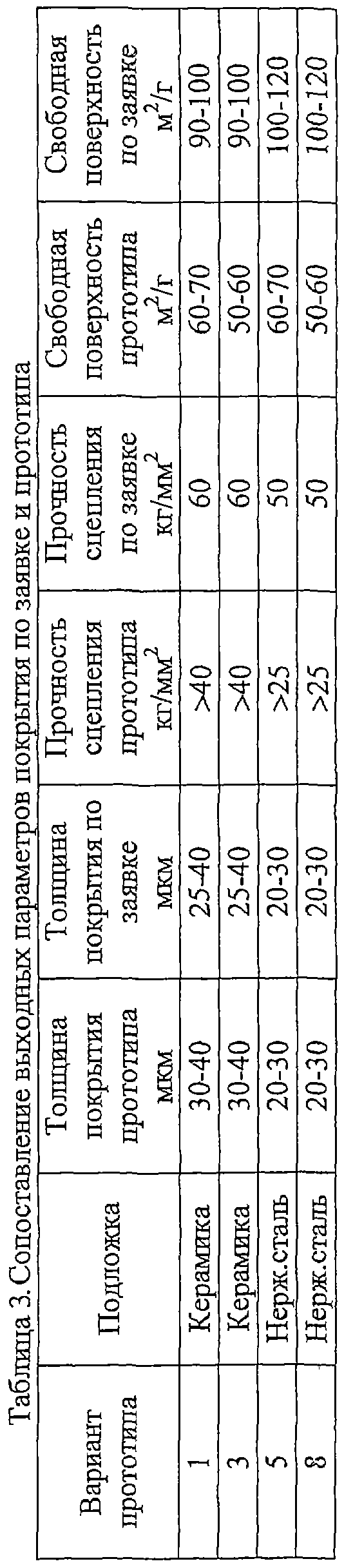 Из сопоставленных данных видно, что как по прочностным (прочность сцепления с подложкой), так и по специальным характеристикам (свободная поверхность покрытия после термообработки) предлагаемая технология значительно опережает прототип.