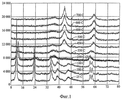 При дальнейшем повышении температуры отжига – свыше 750°С идет образование шпинелей (см. фиг.1, где представлены результаты рентгеновского исследования термического разложения гидротальцита системы Al-Mg-Cu).