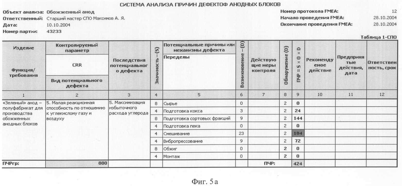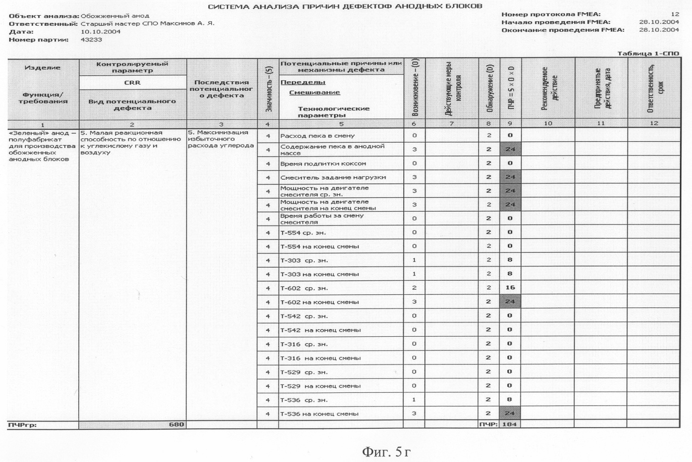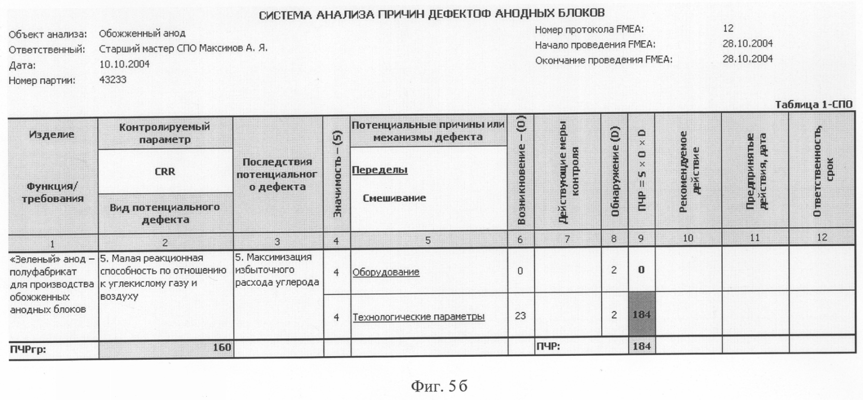1. Способ статистического управления качеством электродной продукции при ее производстве, включающий определение требований к функциям продукции, перевод требований к функциям продукции в показатели качества продукции, выбор критических параметров переделов технологического процесса, измерение, статистический учет и анализ отклонений критических параметров переделов технологического процесса и показателей качества продукции в сравнении с выбранными значениями, отличающийся тем, что дополнительно производят управление рисками технологического процесса путем вычисления комплексного риска технологического процесса как суммы приоритетных чисел рисков его переделов, сравнивают комплексный риск переделов с его граничным значением и при его превышении выполняют корректирующие действия для устранения отклонений критических параметров переделов технологического процесса, имеющих наибольшие значения приоритетного числа риска, осуществляют оценку эффективности корректирующих действий, при этом приоритетное число риска переделов равно произведению значений критериев значимости, возникновения и обнаружения причины, где критерии значимости и обнаружения причины определены по экспертным оценкам, а критерий возникновения пропорционален частоте возникновения отклонений критических параметров переделов от заданных требований, выявляют причины дефектов продукции проведением приемочного контроля качества продукции с выявлением вида дефекта, номера и периода выпуска партии продукции, рассчитывают потенциальное число риска для технологических переделов, включая сырье, осуществляют выбор технологических переделов с наибольшими значениями потенциального числа риска и определяют для них критические параметры и оборудование с наибольшими значениями потенциального числа риска.