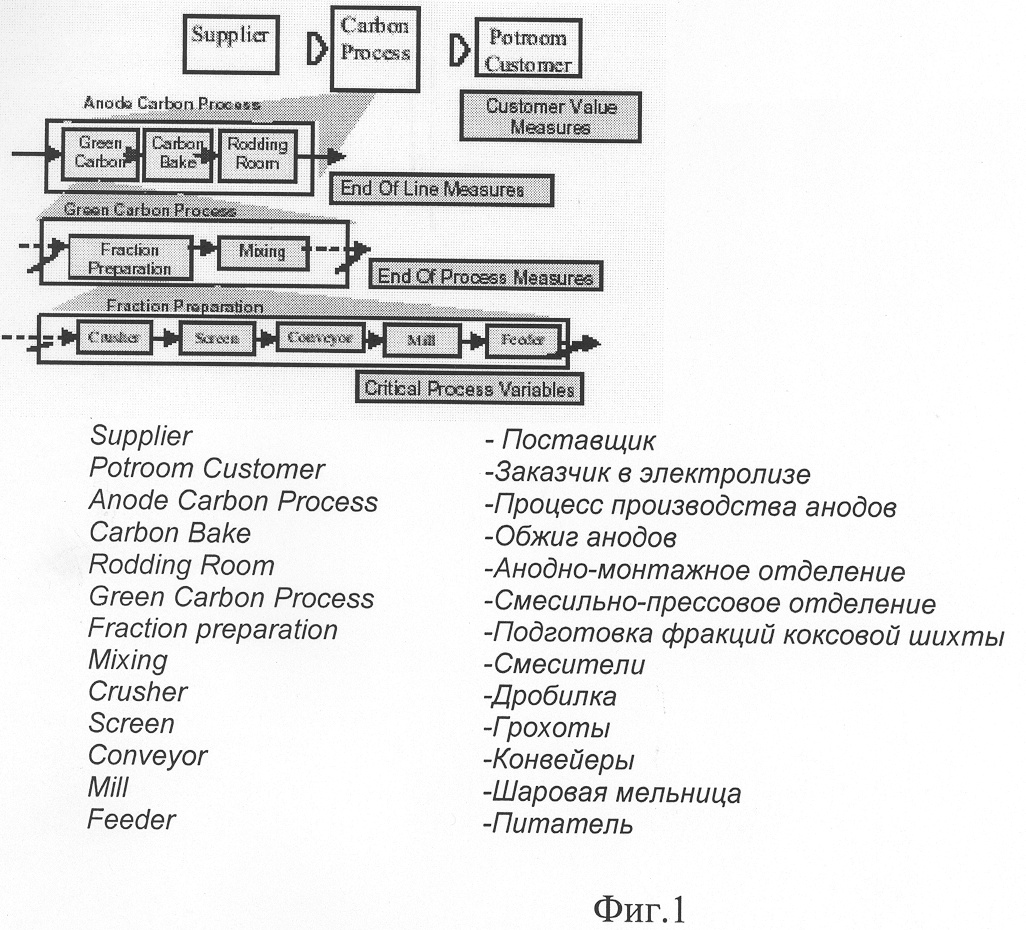 Наиболее близким по совокупности существенных признаков к предложенному способу является способ статистического управления производством электродов (Keith Sinclair, Barry Sadler. Going beyond SPC – why we need statistical thinking in operation such as carbon plants. Light Metals 2004, pp.567-572. “За рамками статистических методов или почему в управлении технологией производства электродов требуется статистическое мышление”). Этот способ, дополнительно к первому способу, предусматривает разработку модели иерархии параметров, соответствующих отдельным уровням и подпроцессам внутри бизнеса, а также определение критических технологических параметров и показателей процесса.