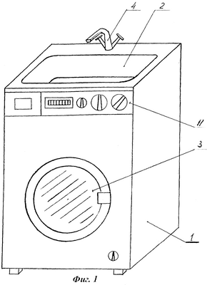 Известна стиральная машина (авт. свид. СССР №1721142, кл. D 06 F 29/06, опубл. 23.03.92 г. [2]), содержащая корпус и помещенный в нем стиральный бак с активатором. Корпус имеет крышку в виде раковины умывальника. Над раковиной установлен кран-смеситель, к которому подключены водопроводные трубы с горячей и холодной водой.