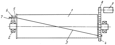 Устройство работает следующим образом. Сукно вращает вал 1. Для его перемещения включают двигатель 9, который поворачивает зубчатые колеса 8 и 4, смещая гибкую струну 3 вокруг оси вала, что ведет к перемещению сукна вдоль вала 1.