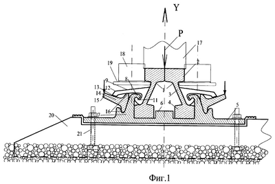 Рельсовый блок состоит из симметричной пары двуглавых рельсов 1, являющихся кососимметричными. Каждый из них содержит верхнюю рабочую главу 2, шейку 3, наклонную к вертикальной линии симметрии (ось Y) под углом =15…20° и нижнюю главу 4, являющуюся запасной. Нижняя глава 4 каждого из двуглавых рельсов 1 западает в непрерывное по всей длине рельса углубление, в подрельсовой подкладке 5, такой же длины, как и двуглавый рельс. Между углублениями образован выступ 6. Подрельсовая подкладка 5 выполнена прокатом и симметрична относительно вертикальной оси Y. Она снабжена Г-образными гребнями 7, направленными выступами навстречу друг другу и нависающими над подошвой рельса.