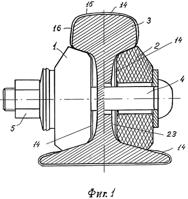Рельсовое стыковое электроизолирующее соединение содержит первую 1 и вторую 2 стыковые накладки, которые расположены по обе стороны стыкуемых рельсов (на фиг.1 показан один рельс 3). В представленном на чертежах варианте осуществления изобретения используются клиновидные (расклинивающего типа (стыковые накладки 1 и 2, выполненные из композитного диэлектрического материала, например стеклопластика. Однако могут быть использованы стыковые накладки других конструкций, например многослойные (см. патент RU-С1 – №2061137, 1996), а также полнопрофильные (см. Альбом чертежей верхнего строения железнодорожного пути, МПС РФ, Москва, Транспорт, 1995, с.140, черт.137). Стыковые накладки 1 и 2 стянуты посредством крепежных элементов, преимущественно болтами 4 с гайками 5. Кроме того, рельсовой стыковое электроизолирующее соединение содержит междурельсовую прокладку 6, которая расположена между торцами стыкуемых рельсов и выполнена в виде пластины из композитного диэлектрического материала. Междурельсовая прокладка 6 включает головку 7, шейку 8, подошву 9, а также торцевую 10 и боковые 11 поверхности. Головка 7 и подошва 9 междурельсовой прокладки 6 выполнены в форме, повторяющей форму поперечного сечения соответственно головки и подошвы стыкуемых рельсов, а шейка 8 междурельсовой прокладки 6 выполнена с формой торцевых поверхностей 12 и 13, повторяющих форму обращенных к ним поверхностей стыковых накладок 1 и 2. На торцевой поверхности междурельсовой прокладки 6 выполнен слой 14 из эластичного диэлектрического материала. В предпочтительном варианте осуществления изобретения слой 14 выполнен по всей торцевой поверхности 10 (по всему периметру). Однако для достижения ожидаемого технического результата достаточно, чтобы слой 14 был выполнен, во-первых, на торцевых поверхностях 15 и 16 головки 7, соответствующих рабочим поверхностям головок стыкуемых рельсов (верхней и внутренней сторонам рельса), во-вторых, на торцевых поверхностях 17 и 16 головки 7 и на торцевых поверхностях 19 и 20 подошвы 9, контактирующих со стыковыми накладками 1 и 2, и, в – третьих, на торцевых поверхностях 12 и 13 шейки 8. Слой 14 из эластичного материала частично выступает за контур 21 (фиг.2) поперечного сечения головки и за контур 22 поперечного сечения подошвы стыкуемых рельсов. Шейка 8 выполнена с поперечными размерами Н(Z), зависящими, естественно, от вертикальной координаты – Z, и обеспечивающими контакт ее торцевых поверхностей 12 и 13 по всей их длине с соответствующими им стыковыми накладками 1 и 2 и упругую деформацию слоя 14 из эластичного материала. Иными словами, поперечный размер Н(Z) шейки 8 и достигаемое при стяжке расстояние – R(Z) между обращенными друг к другу поверхностями стыковых накладок 1 и 2 должно удовлетворять неравенству: Н(Z)>R(Z)>Н(Z)-2h, где h – толщина слоя 14 из эластичного материала. Изготавливается междурельсовая прокладка 6, предпочтительно, формовкой: сначала осуществляют формовку внутренней жесткой части 23, а затем – слоя 14 из эластичного материала. Высота выступающей за контур 21 поперечного сечения головки стыкуемых рельсов части слоя 14 из эластичного материала составляет несколько миллиметров и выбирается из условия обеспечения полного ее утапливания за счет упругой деформации слоя 14 при контакте его с колесами единиц подвижного состава.