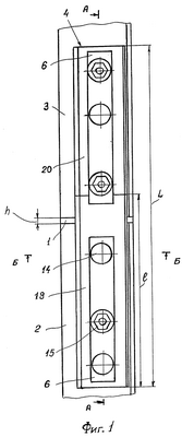 Выполнение этого условия обеспечивает размещение междурельсовой прокладки 1 напротив электроизолированных участков 18 стыковых накладок 4 и 5, при этом по обе стороны каждого рельса 2 и 3 стыка расположены первый участок 18 одной стыковой накладки и второй участок 20 другой стыковой накладки (фиг.2). Ступенька на элементе 7 удлиненной формы может быть выполнена либо (как показано на чертежах) заодно с ним, например фрезерованием или наплавкой металла, либо путем механического соединения отдельных элементов между собой любым известным способом. Силовые линии магнитного поля обозначены позицией 21. В предпочтительном варианте осуществления изобретения в поперечных сквозных отверстиях, выполненных на участке 18, установлены втулки 22, выполненные из электроизоляционного материала.
